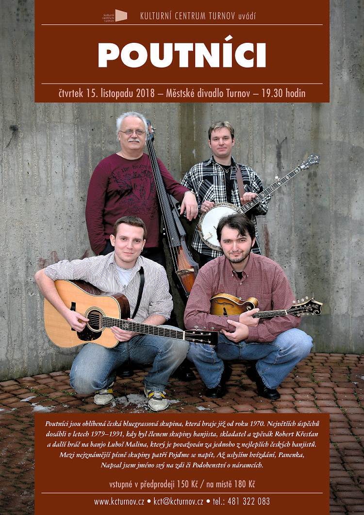 * POUTNÍCI. Poutníci jsou česká bluegrassová skupina, která vznikla v roce 1970. Největších úspěchů dosáhli v letech 1979 – 1991, kdy byl členem skupiny banjista, skladatel a zpěvák Robert Křesťan a další hráč na banjo Luboš Malina. Mezi nejznámější písně skupiny patří Pojďme se napít, Až uslyším hvízdání, Panenka, Napsal jsem jméno svý na zdi či Podobenství o náramcích. Městské divadlo Turnov od 19.30 hodin. Vstupné v předprodeji 150 Kč, na místě 180 Kč.