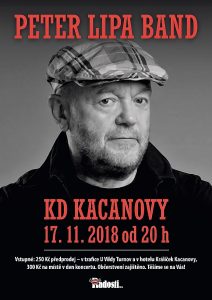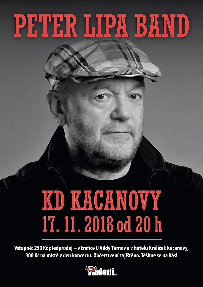 * PETER LIPA BAND. Koncert legendárního slovenského jazzmana. Po jeho skončení zahraje turnovský FD Band. KD Kacanovy od 20.00 hodin. Předprodej: Trafika U Vildy, Skálova ulice, Turnov a Hotel Králíček, Kacanovy.