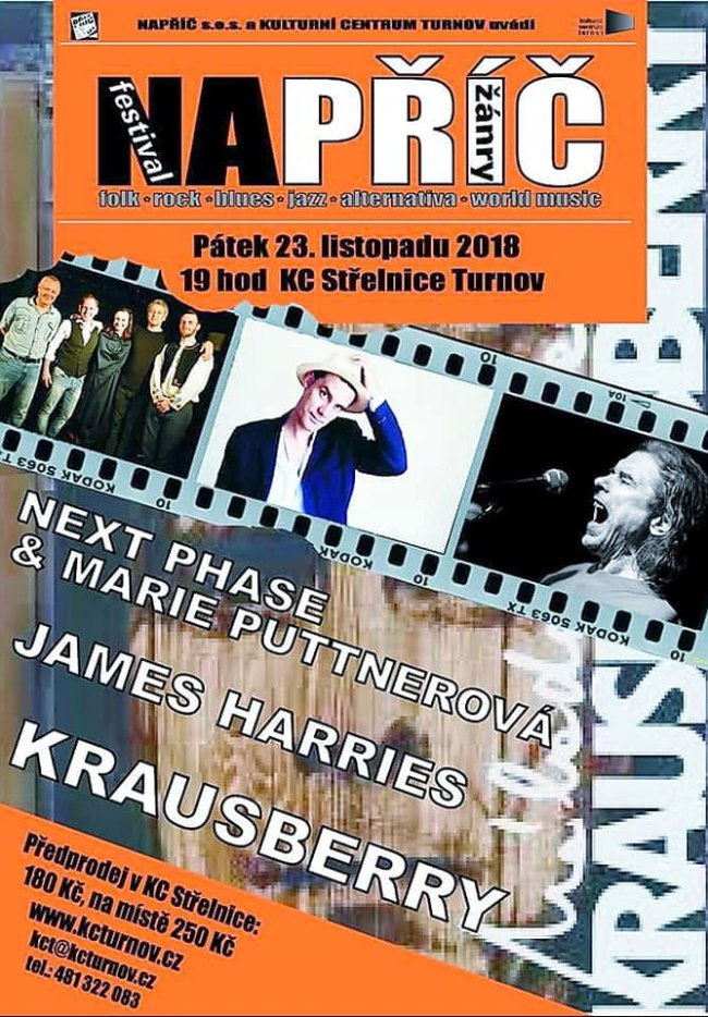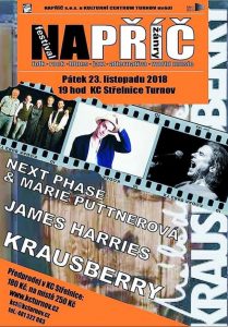 * NAPŘÍČ FEST 2018. Myšlenkou „minifestivalu“ NAPŘÍČ je spojit zajímavé muzikanty, kteří by se třeba na pódiu nikdy nesetkali, představit (nejen turnovským) divákům neokoukané, ale o to zajímavější kapely a písničkáře, ale především přiblížit jim trochu jiné hudební žánry a originální interprety, než ty, které jim vnucuje každodenní mainstream.