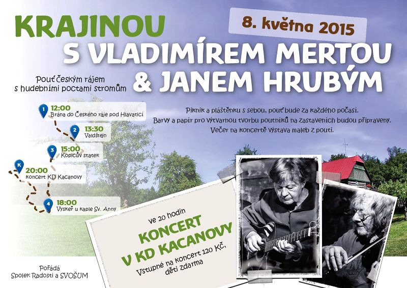 Na putování navazuje od 20.00 KONCERT v kulturním domě Kacanovy, vstupné na koncert 120 Kč, děti zdarma. Pořádá Spolek Radosti a SVOŠUM.