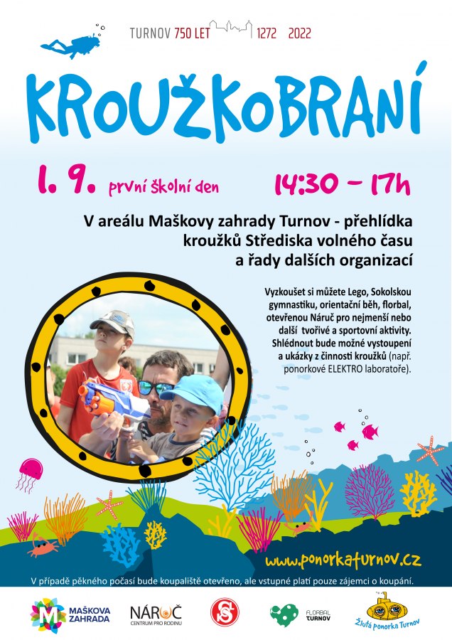 * 1. září od 14.30 hodin: KROUŽKOBRANÍ v Maškovce. První školní den se v areálu Maškovy zahrady uskuteční přehlídka kroužků Střediska volného času a dalších turnovských spolků. Vyzkoušet si můžete lego, sokolskou gymnastiku, orientační běh, florbal, otevřenou Náruč pro nejmenší i další tvořivé a sportovní aktivity. Vidět bude možné krátké vystoupení a ukázky z činnosti kroužků (např. ponorkové Elektro laboratoře).