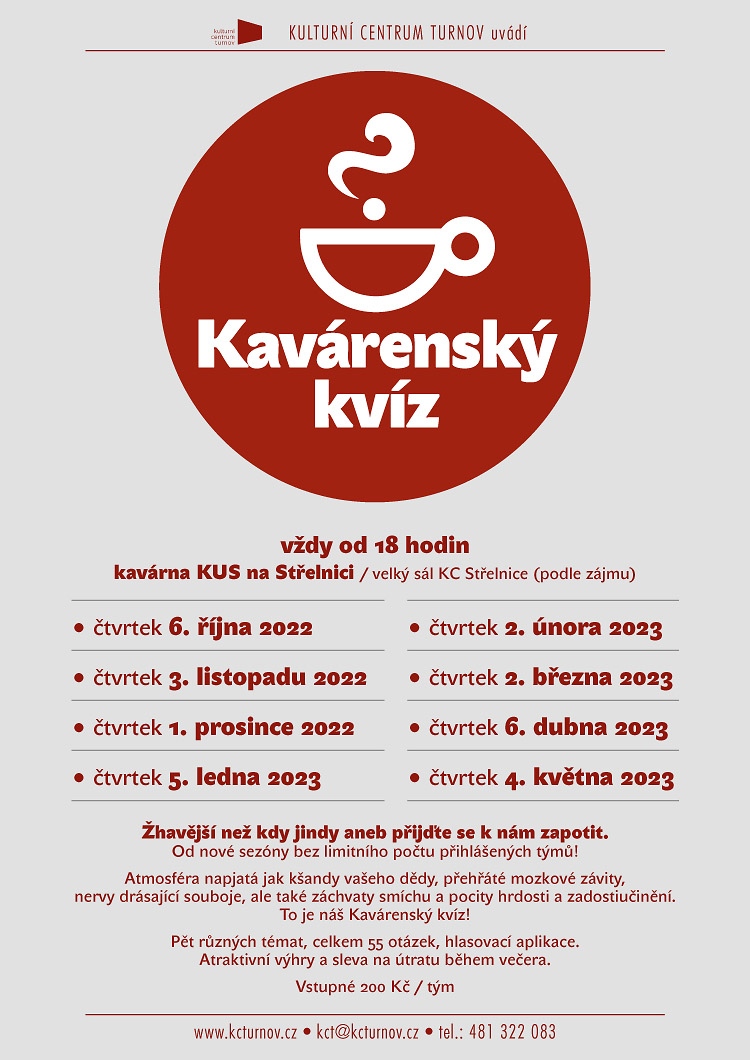 * KAVÁRENSKÝ KVÍZ. Oblíbené soutěžení se vrací v nové sezoně. Kavárna KUS na Střelnici od 18.00 hodin, vstupné 200 Kč za tým.