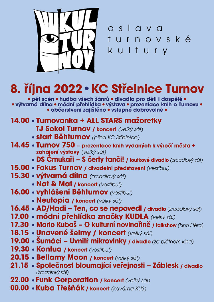 * KULTURNOV 2022. V sobotu 8. října se turnovská Střelnice zase po roce zaplní turnovskými umělci nejrůznějšího zaměření a návštěvníky, pro něž je turnovská kultura pojmem. Již sedmý ročník festivalu Kulturnov opět představí pestrou směsici turnovských muzikantů, herců, literátů, tanečníků či výtvarníků. Na své si přijdou děti i dospělí, příznivci hudby i divadla, konzervativci i liberálové. A je jisté, že nebude nouze ani o překvapení.