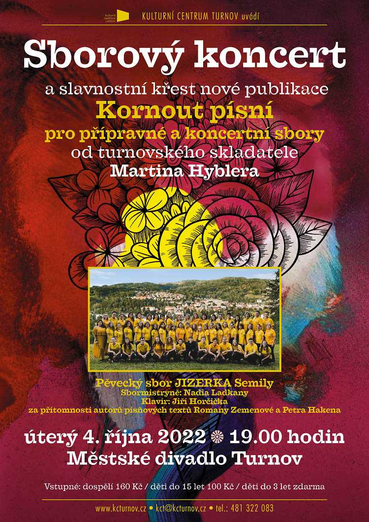 * KORNOUT PÍSNÍ MARTINA HYBLERA. Sborový koncert a slavnostní křest nové publikace pro přípravné a koncertní sbory od turnovského skladatele Martina Hyblera. Pozvání přijal sbor Jizerka ze Semil, který pod vedením sbormistryně Nadii Ladkany přednese čtrnáct písní z nového alba s názvem Kornout písní. Slavnostní večer proběhne za přítomnosti turnovských textařů Petra Hakena a Romany Zemenové, která je autorkou většiny písňových textů. Na klavír doprovodí Jiří Horčička. Publikaci bude možné si zakoupit na místě. Městské divadlo Turnov od 19.00 hodin, vstupné 160 Kč, děti do 15 let 100 Kč.