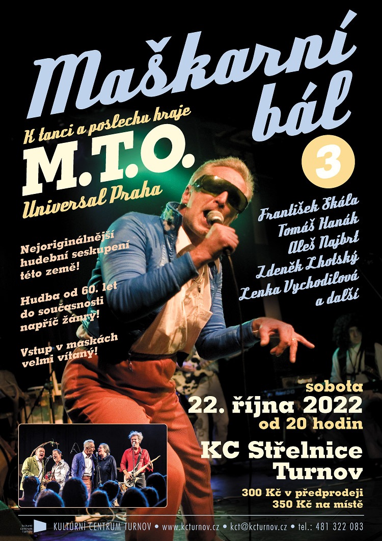 * MAŠKARNÍ BÁL S M.T.O. UNIVERSAL PRAHA. Přijďte si zatančit na vystoupení nejoriginálnějšího hudebního seskupení této země, které pro vás s nadhledem a napříč žánry zmapuje hudební scénu od 60. let do současnosti. Maškarní pro dospělé, KC Střelnice od 20.00 hodin, vstupné v předprodeji 300 Kč, na místě 350 Kč.