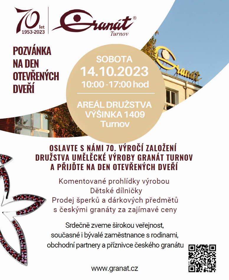 * Družstvo Granát Turnov pořádá DEN OTEVŘENÝCH DVEŘÍ, který bude probíhat od 10.00 do 17.00 hodin v areálu družstva. Přijďte s námi oslavit výročí 70 let družstva. Prostřednictvím komentovaných prohlídek (prohlídky nejsou bezbariérové) budou zpřístupněny výrobní prostory s ukázkou produkce šperků s českými granáty. Děti se v připravených dílničkách mohou alespoň na chvíli stát zlatnickým mistrem. Na místě můžete nakoupit šperky a dárkové dekorativní předměty s českými granáty za zvýhodněné ceny. K návštěvě srdečně zveme širokou veřejnost, zejména současné a bývalé zaměstnance družstva s rodinami, obchodní partnery a příznivce českého granátu. Viz také www.granat.cz.
