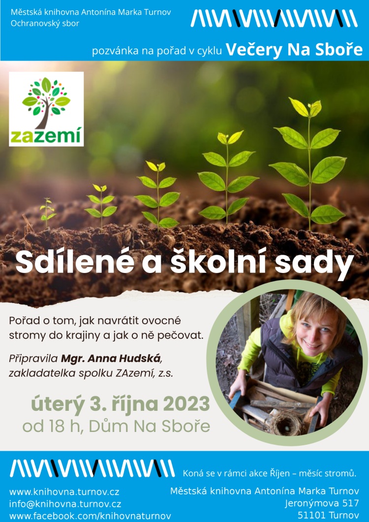 * VEČER NA SBOŘE – SDÍLENÉ A ŠKOLNÍ SADY. Své aktivity představí spolek ZAzemí. Členové spolku dlouhodobě pečují o krajinu Českého ráje. Sází stromy, keře, pěstují zeleninu, kompostují na sídlištích, zakládají komunitní chovy a další aktivity. Pořad připravila Anna Hudská, zakladatelka spolku. Dům Na Sboře ve Skálově ulici od 18.00 hodin. Připravuje Knihovna A. Marka.