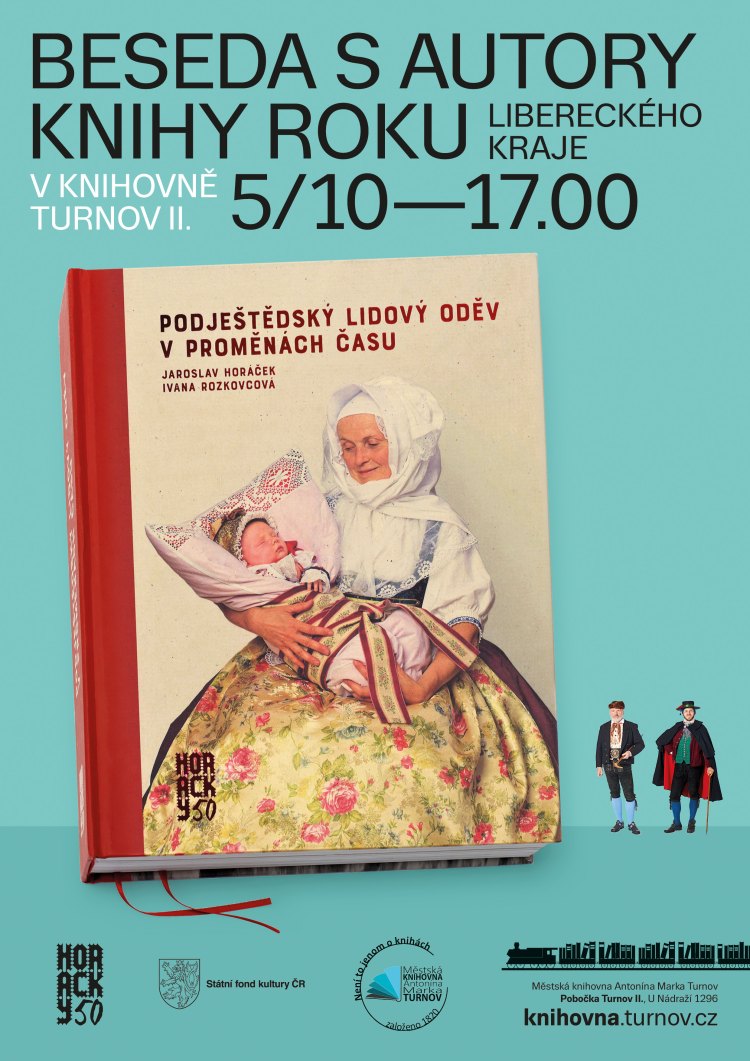 * PODJEŠTĚDSKÝ LIDOVÝ KROJ V PROMĚNÁCH ČASU. Představení nové regionální publikace, ve které je zachyceno, jak se v Podještědí oblékali naši předkové na různé lidové slavnosti (pouť, tancovačky) či v čem pracovali na poli, co jsou to kožinky, krejzlík či mezulán a mnoho dalšího. Knihu představí autor Jaroslav Horáček, grafik a fotograf publikace Petr Pivoňka a další členové souboru Horačky – kniha vyšla k 50. výročí souboru. Knihovna na vlakovém nádraží Turnov II od 17.00 hodin.