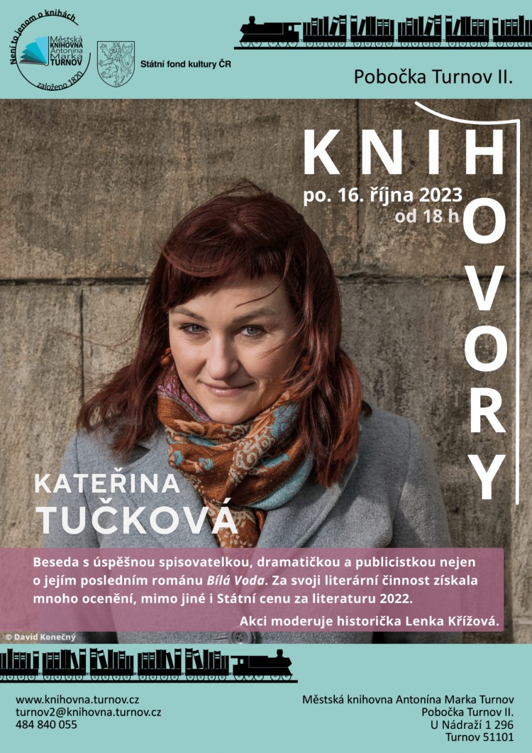 * KNIHOVORY: KATEŘINA TUČKOVÁ. Beseda s úspěšnou spisovatelkou, dramatičkou a publicistkou nejen o jejím posledním románu Bílá Voda. Za svoji literární činnost získala několik ocenění – např. Magnesia Litera (2010, 2013), Cenu Josefa Škvoreckého (2013), Cenu Český bestseller (2012, 2023) či Státní cenu za literaturu v roce 2022. Akci moderuje historička Lenka Křížová. Knihovna na vlakovém nádraží Turnov II od 18.00 hodin.