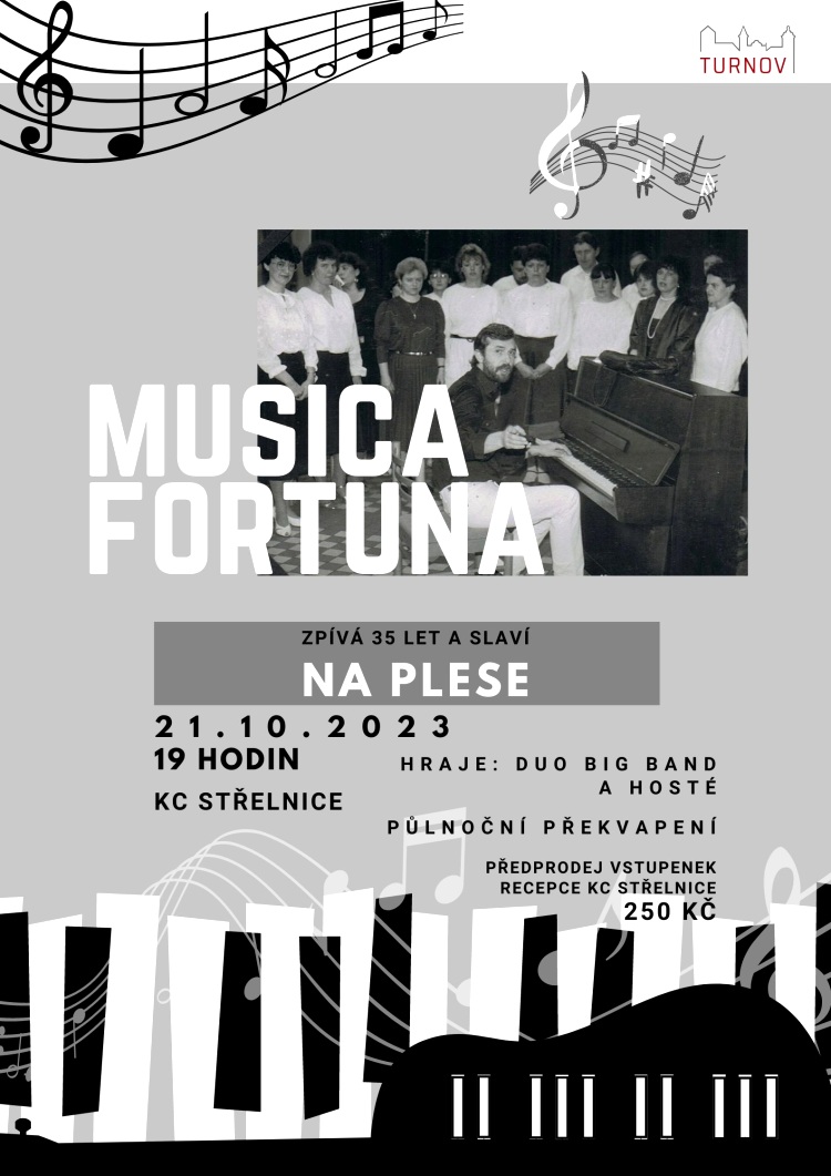 * MUSICA FORTUNA SLAVÍ 35 LET – NA PLESE! Při příležitosti půlkulatého jubilea, kdy sbor připomíná svou dlouholetou existenci, si dovoluje pozvat nejen skalní příznivce, ale i širokou veřejnost na jedinečnou kulturní akci: Musica Fortuna slaví – zpívá i tančí na plese! Na programu je od 19.00 hodin zahajovací koncert, v němž sbor potěší publikum průřezovým výběrem toho nejlepšího z repertoáru. A pak už se bude nejen zpívat, ale hlavně tančit. Ve 20.00 hodin přijde na řadu Duo BigBand a jeho hosté, kteří rozhodně nedovolí nikomu posedávat na židlích. Samozřejmě se můžete těšit i na několik vstupů a překvapení, ale to přece od „fortuňáků“ můžeme čekat… Přijďte s nimi pobýt – zavzpomínat – zazpívat – popovídat – zatančit si… Jste srdečně zváni! Ples, Střelnice od 19.00 hodin, vstupné 250 Kč.