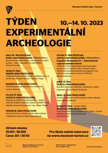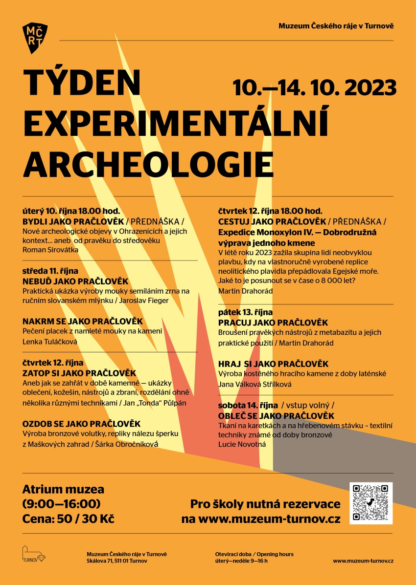 * TÝDEN EXPERIMENTÁLNÍ ARCHEOLOGIE. Akce probíhá v atriu Muzea Českého ráje. V úterý 10. října od 18.00 hod. přednáška BYDLI JAKO PRAČLOVĚK – nové archeologické objevy v Ohrazenicích a jejich kontext. Ve středu po celý den ukázky mletí zrna a pečení placek (NEBUĎ JAKO PRAČLOVĚK). Ve čtvrtek12. října ZATOP SI JAKO PRAČLOVĚK – jak se zahřát v době kamenné, ukázky oblečení, kožešin, nástrojů a zbraní, rozdělání ohně několika různými technikami, a OZDOB SE JAKO PRAČLOVĚK – výroba repliky šperku nalezeného v Maškově zahradě; od 18.00 hod. přednáška CESTUJ JAKO PRAČLOVĚK. Tématem pátku 13. října je PRACUJ JAKO PRAČLOVĚK a HRAJ SI JAKO PRAČLOVĚK. Závěrečné sobotní téma je OBLEČ SE JAKO PRAČLOVĚK. Atrium muzea (9.00-16.00 hodin). Více informací na https://www.muzeum-turnov.cz/…/tyden-experimentalni…/