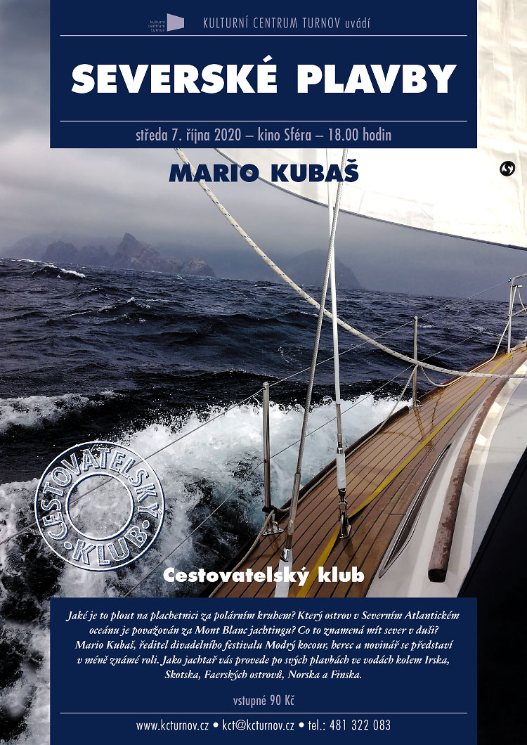 * MARIO KUBAŠ: SEVERSKÉ PLAVBY ANEB PROČ MAJÍ NA FAERSKÝCH OSTROVECH VŠECHNO VĚTŠÍ. Jaké je to plout na plachetnici za polárním kruhem? Který ostrov v severním Atlantickém oceánu je považován za Mont Blanc jachtingu? Mario Kubaš, ředitel divadelního festivalu Modrý kocour, herec a novinář se představí v méně známé roli. Jako jachtař vás provede po svých plavbách ve vodách kolem Irska, Skotska, Faerských ostrovů, Norska a Finska. Cestovatelský klub, kino Sféra od 18.00 hodin, vstupné 90 Kč.