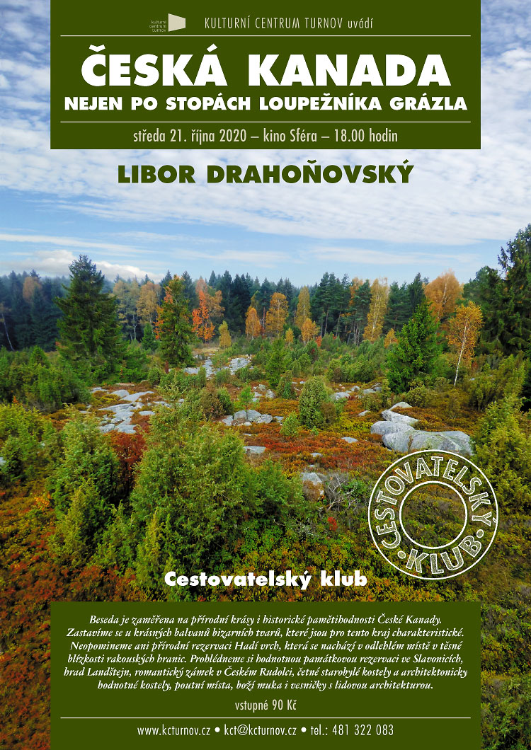 * LIBOR DRAHOŇOVSKÝ: ČESKÁ KANADA, NEJEN PO STOPÁCH LOUPEŽNÍKA GRÁZLA. Cestovatelský klub, kino Sféra od 18.00 hodin, vstupné 90 Kč. (Akce zrušena z důvodu opatření nouzového stavu II.)