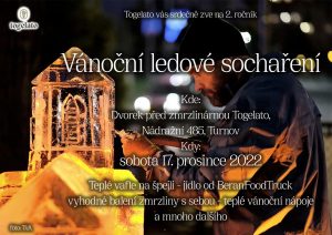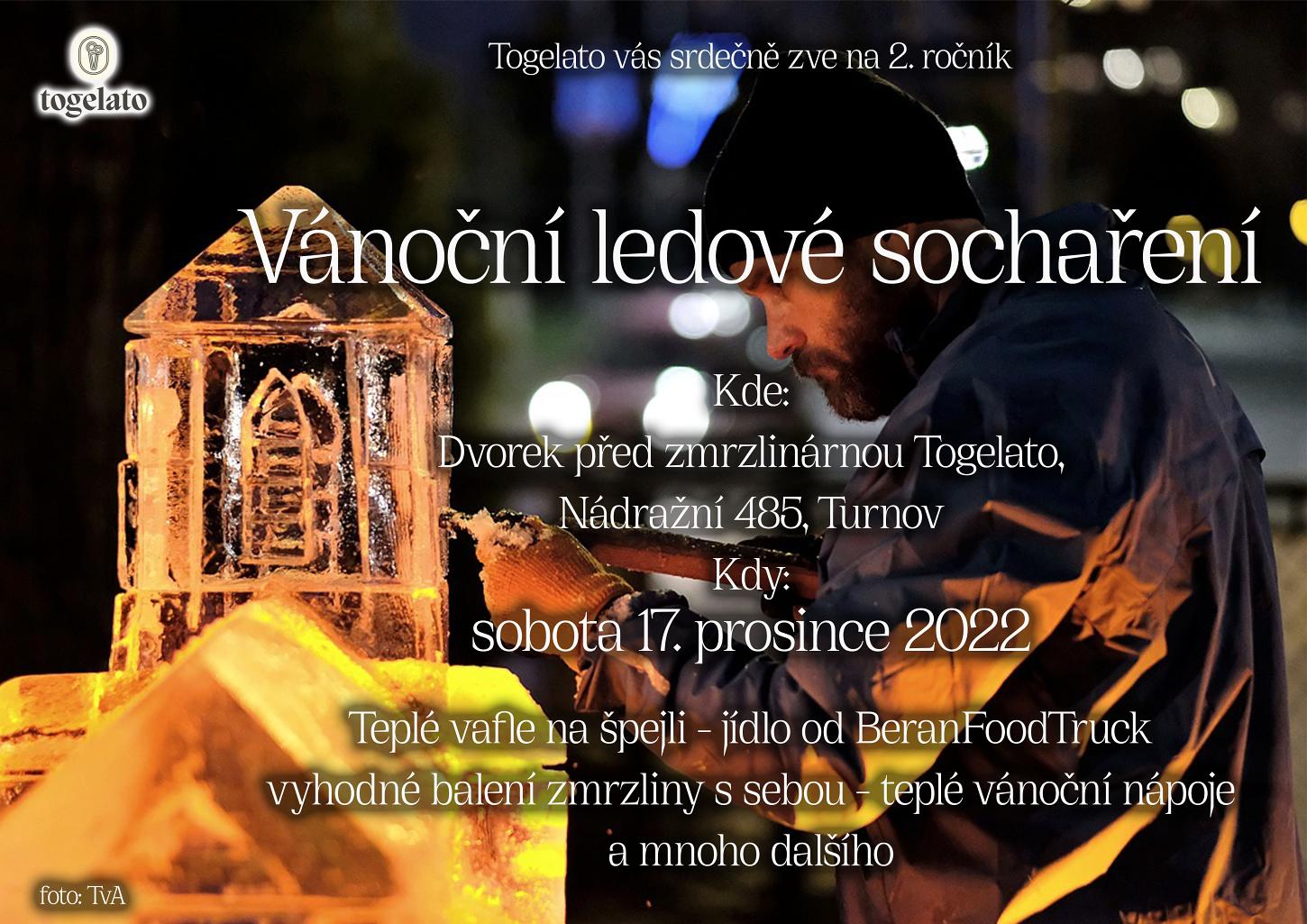 Po úspěchu z loňského adventu se v Turnově opět uskuteční ledové sochaření. Na dvorku u zmrzlinárny Togelato v Nádražní ulici proběhne vánoční akce v sobotu 17. prosince od 11.00 hodin. Sochař Marian Maršálek zde z více než tuny ledu vytvoří sochu turnovské radnice. Kromě podívané na samotnou tvorbu a finální nasvícené dílo budou k dispozici Beran Food Truck se svým vyhlášeným jídlem, stánek se svařákem, teplými vaflemi a organizátoři z Togelato připravili speciální nabídku italské zmrzliny na doma.
