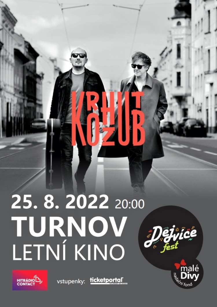 * KRHUT & KOZUB. Herec Štěpán Kozub a hudebník a textař Jiří Krhut vydali na konci roku 2020 své debutové album s názvem Prásknu bičem a hned v únoru 2021 natočili videoklip Práce pro šaška. Tato ostravská dvojka si rychle získala srdce posluchačů napříč generacemi. Letní kino Turnov od 20.00 hodin, vstupné 590 Kč.