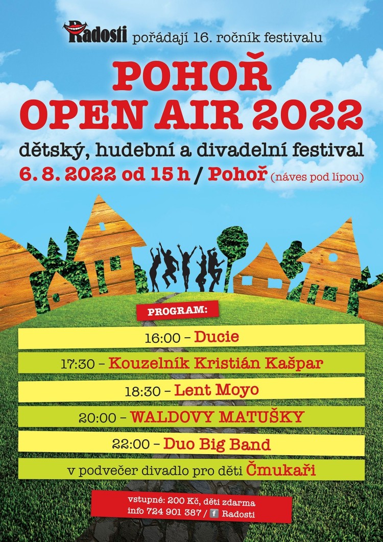 * POHOŘ OPEN AIR 2022, 16. ročník. Dětský, hudební a divadelní festival. Od 15.00 hodin na návsi na Pohoři (mezi Kacanovy a Olešnicí). Program: 16.00 Ducie, 17.30 kouzelník Kristián Kašpar, 18.30 Lent Moyo, 20.00 Waldovy Matušky, 22.00 Duo BigBand. Vpodvečer pro děti zahrají Čmukaři. Vstupné 200 Kč, děti zdarma.