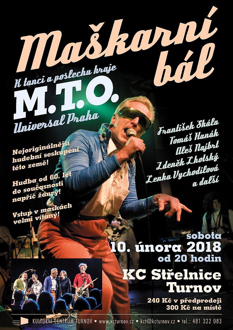 * MAŠKARNÍ BÁL PRO DOSPĚLÉ. Na letošním, historicky prvním maškarním plese vám k tanci a poslechu bude hrát jedinečné uskupení M.T.O. Universal Praha, které lze s trochou nadsázky označit za nejoriginálnější hudební spolek této země. V jeho repertoáru jsou veškeré hity napříč hudební scénou od 60. let do současnosti. Těšte se na Františka Skálu, Tomáše Hanáka, Zdeňka Lhotského, Lenku Vychodilovou a další známé umělce, kteří vám průběh večera zpestří písněmi od Elvise Presleyho a Toma Jonese přes Franka Sinatru a Pavla Lišku až po Janu Kratochvílovou a Hanku Zagorovou. A krom toho – celý orchestr vystupuje též v originálních kostýmech. Přijďte společně s námi psát historii a nezapomeňte své masky! KC Střelnice od 20.00 hodin. Vstupné v předprodeji 240 Kč, na místě 300 Kč.