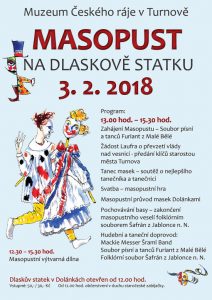 * MASOPUST NA DLASKOVĚ STATKU. Masopustní rej na Dlaskově statku letos proběhne za účasti folklorního souboru Šafrán z Jablonce nad Nisou a Souboru písní a tanců Furiant z Malé Bělé. Návštěvníci si budou moci prohlédnout všechny tradiční masky: turky, kominíky, slaměné, nevěstu, ženicha, šašky, ženušku, židy, medvěda a mnohé další. Chybět nebudou tradiční speciality domácí zabijačky, masopustní koblihy a samozřejmě i dobré moky pro zahřátí. Součástí programu bude masopustní výtvarná dílna pro děti (12.00 – 15.00 hod.).