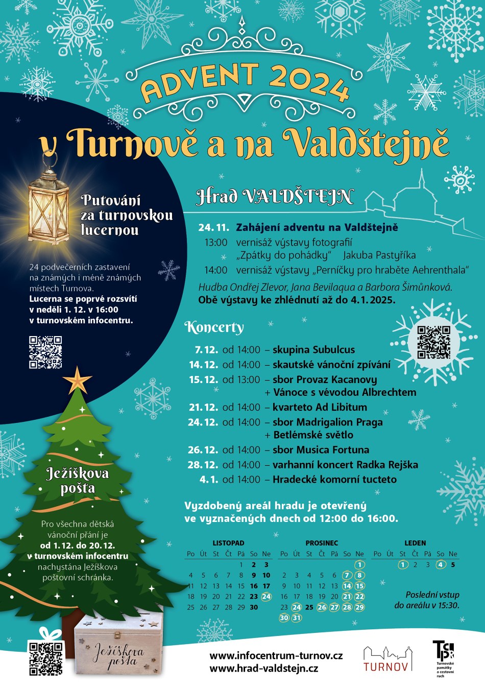 Během konání akce se platí dobrovolné vstupné a návštěvníci si mohou prohlédnout první a druhé nádvoří včetně salonku v přízemí klasicistního domu a kaple sv. Jana Nepomuckého. Pestrý adventní a vánoční program najdou návštěvníci na webových stránkách www.hrad-valdstejn.cz. Hrad bude otevřen vždy od 12.00 do 16.00 hodin (poslední vstup v 15.30 hodin).