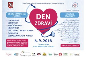 * DEN ZDRAVÍ. Program pro děti, jejich rodiče a prarodiče – areál Nemocnice Turnov od 13.00 do 17.00 hodin. Ve 14.00, 14.30, 15.00 a v 15.30 hodin skupinové prohlídky nemocnice včetně operačních sálů. Venkovní stanoviště: měření tlaku, glykémie, hygiena rukou, ukázka rehabilitace, cvičení pro maminky s miminky, jóga pro děti, šlapací auta, inline bruslení, beseda s youtuberem Martinem Rotou, parkour, skákací hrad, Vojenská zdravotní pojišťovna a další. V doprovodném programu mj. vystoupí Duo Bigband, Yogaholick, Taneční skupina Keltský tygr ad. Občerstvení zajištěno. Více na www.nemlib.cz.