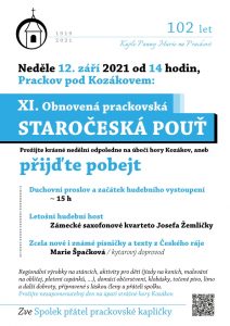 * Spolek přátel prackovské kapličky zve srdečně své příznivce, přátelé, známé i známé svých známých na XI. STAROČESKOU OBNOVENOU POUŤ. Začátek ve 14.00 hodin – domácí dobroty, pivo, limo, klobásky, od 15.00 hodin duchovní promluva a hudební vystoupení Zámeckého saxofonového kvarteta Josef Žemličky. Na závěr své nové písničky z Českého ráje uvede Maruška Špačková. Stánky s regionálními výrobky, atrakce pro děti (včetně možnosti jízdy na koních) a dobrá nálada jako vždy.
