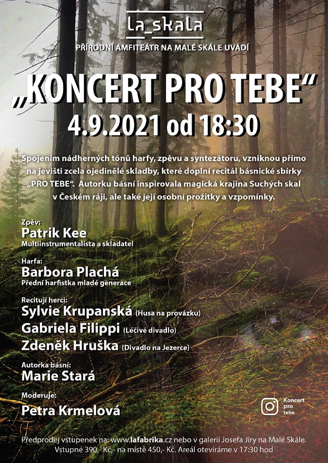 * KONCERT PRO TEBE. Spojením nádherných tónů harfy, zpěvu a syntezátoru vzniknou přímo na jevišti ojedinělé skladby, které doplní recitál básnické sbírky „Pro tebe“. Zpěv Patrik Kee, harfa Barbora Plachá, recitují Sylvie Krupanská, Ganriela Filippi a Zdeněk Hruška, autorkou básní je Marie Stará, moderuje Petra Krmelová. Přírodní amfiteátr LA SKALA v Malé Skále. Začátek v 18.30 hodin. Vstupné 390 Kč, na místě 450 Kč. Více na www.lafabrika.cz.