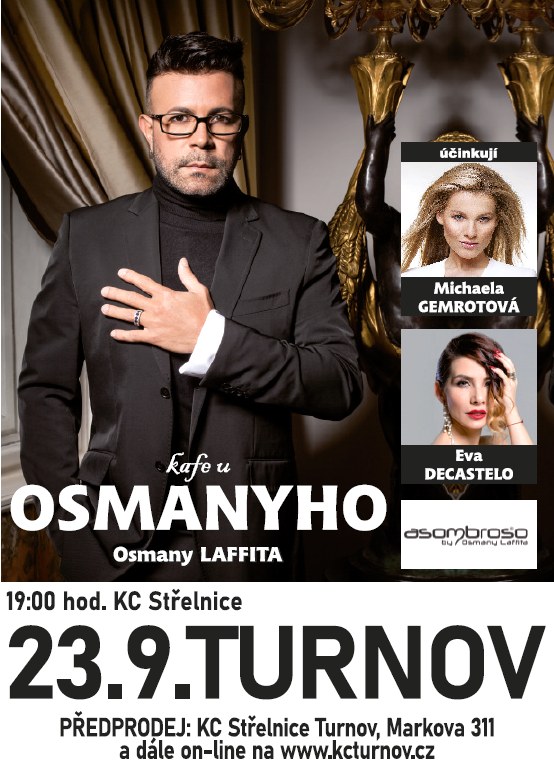 Laffity. Devadesát minut neuvěřitelných historek ze života Osmanyho Laffity, při kterých se divák baví od první chvíle. Osmany odhalí i to, co mělo zůstat utajeno! Moderuje: Eva Decastelo. Účinkují: Osmany Laffita, Michaela Gemrotová (nominována na cenu Thálie za muzikál Evita) nebo Kamila Nývltová. KC Střelnice od 19.00 hodin, vstupné 390 Kč. POZOR! POŘAD BYL ZRUŠEN!