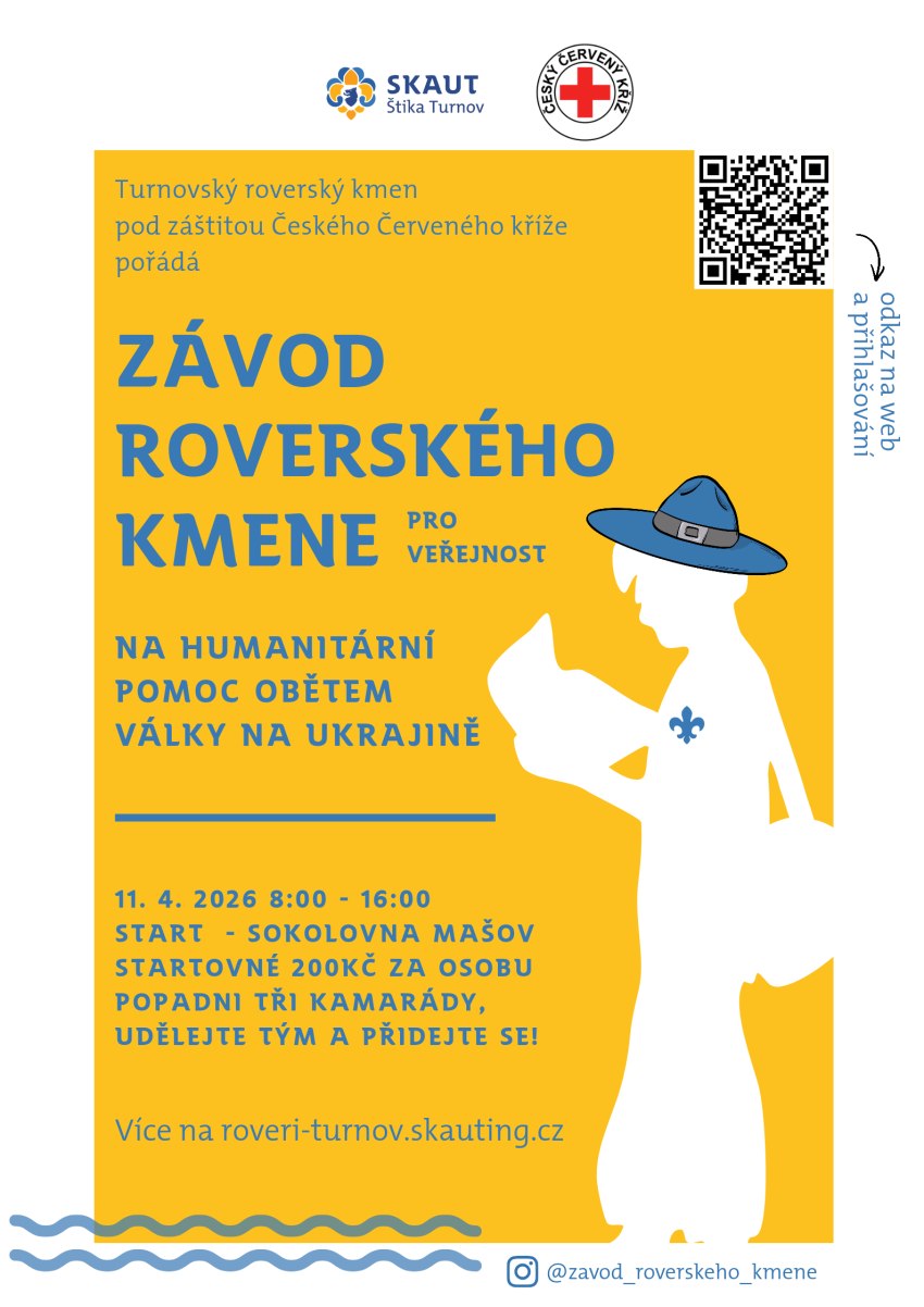 * ZÁVOD ROVERSKÉHO KMENE PRO SKAUTY I NESKAUTY. V rámci závodu roverského kmene si budete moci vyzkoušet skautské dovednosti a podpořit tím dobrou věc! Pod záštitou Českého červeného kříže turnovští skauti pořádají (neběžecký) závod čtyřčlenných skupin. Výtěžek z této akce poputuje na sbírku ČČK – humanitární pomoc Ukrajině. Trasa závodu povede Českým rájem a během této trasy vás čeká několik stanovišť s úkoly. Délka trasy se pohybuje lehce pod 6 km a není vhodná pro kočárky ani jiné pomůcky na kolečkách. Soutěžit se bude ve třech kategoriích: veřejnost, skauti a rodiny s dětmi. Přihlašování a další informace o závodu najdete na webu roverského kmene – https://roveri-turnov.skauting.cz/2026/01/zavod-roverskeho-kmene/. Závod probíhá od 8.00 do 16.00 hodin. Start je u sokolovny v Mašově. Za turnovské skauty Tomáš Trněný, Středisko Štika Turnov, tomastrneny16@gmail.com
