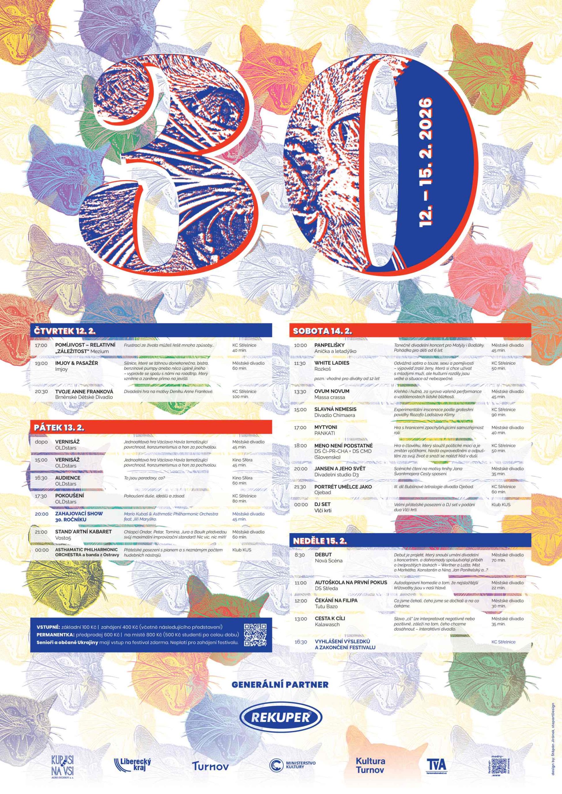 Podrobný program 30. ročníku multižánrového divadelního festivalu, který se uskuteční v turnovském městském divadle a na Střelnici od čtvrtka 12. do neděle 15. února, najdete na webových stránkách www.festival-modry-kocour.cz.