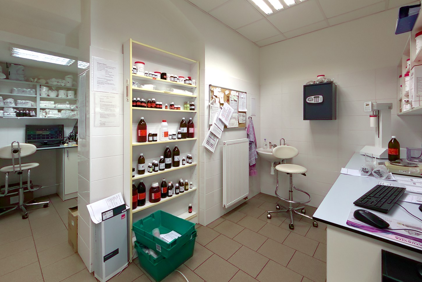 Další velmi důležitou místností je laboratoř. Ta je v každé lékárně vybavena individuálně. Některé lékárny umí připravit masti, roztoky, kapsle, čípky a další přípravky dle receptu lékaře v řádu hodin až dne – mezi ně patří naše turnovské lékárny U Terminálu a V Hloubce. Jiné zvládnou přípravu do druhého dne, například výdejna v Příšovicích, a pak jsou lékárny, které přípravu odesílají do centrálních laboratoří s čekací dobou v řádu dní.