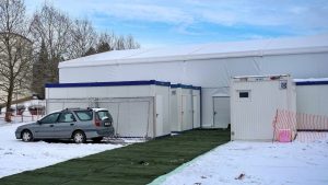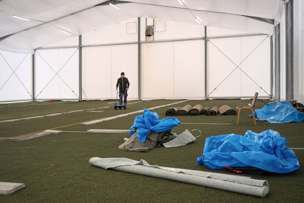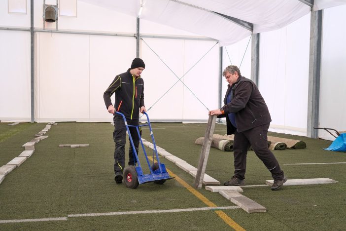 Pracovníci Městské sportovní Turnov pokračují v instalaci zařízení provizorní sportovní haly u turnovského nádraží. Pokládka umělé trávy musela být kvůli silným mrazům posunuta minimálně o jeden týden. Bylo nutné vyčkat na rozmrznutí podloží a jeho následné uválcování, aby bylo možné položit geotextilii a instalovat samotný povrch. V polovině posledního lednového týdne probíhá instalace obrubníků po obvodu haly.