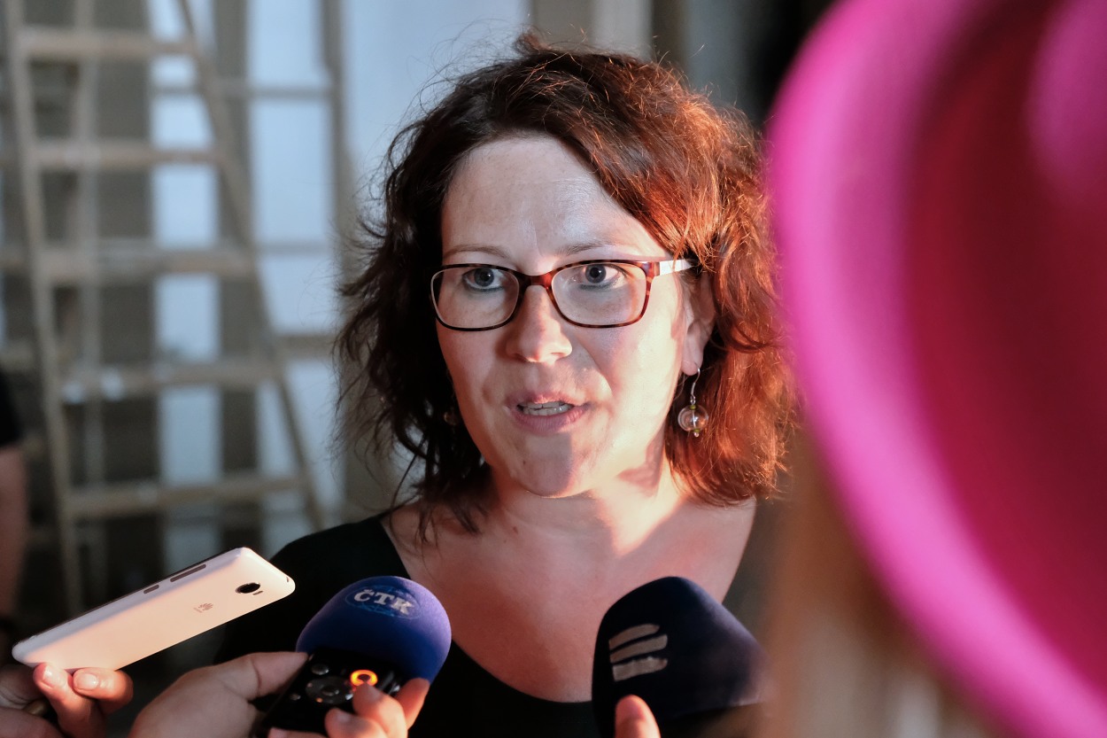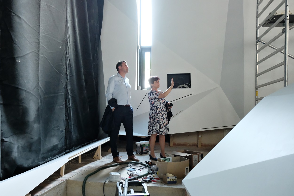 V. Jakouběová s M. Půtou v prostorách vznikající horolezecké expozice (za nimi zakrytý obraz Pobití Sasíků…)