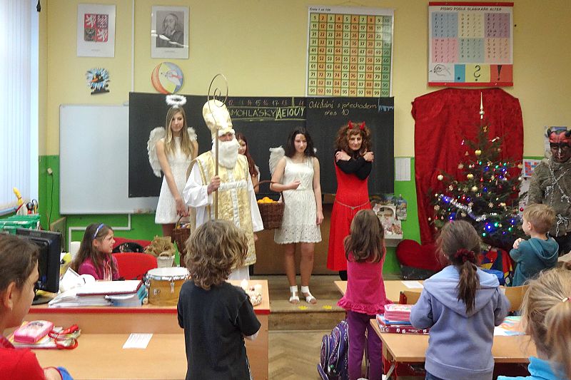 Pondělí 5. prosince byl přesně takový den. Od rána se strojili andělé a čerti s Mikulášem, v ředitelně se objevily krabice s dárky pro děti. Všichni učitelé a učitelky byli oblečeni v červené a černé barvě (čerti) nebo v bílé (andílci), k tomu masky nebo rohy. Už první hodinu školou řinčely řetězy a zvonec, všechny děti z 1. stupně a z nových 6. tříd dostaly mikulášský perník a mandarinku. Většina tříd měla připravenou společnou koledu nebo básničku. Vánoce jsou prostě tady!