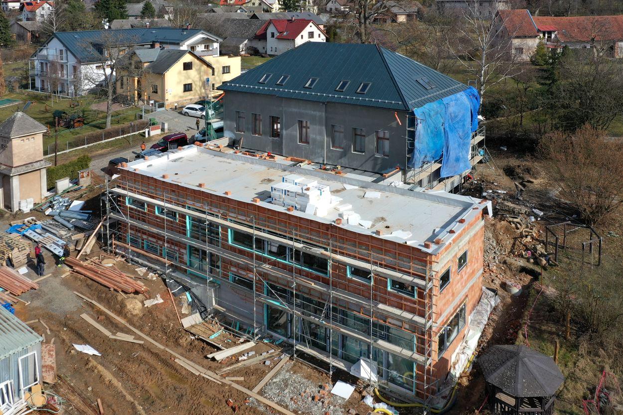 Zateplení starého objektu školy a stavba nového komplexu výrazně změnily vizáž na staveništi. Střecha na původní budově základní školy je těsně před dokončením, na přístavbě je již provedená. V současné době se dělají klempířské práce, na starém objektu je vybudován zateplovací systém. Zateplení je zatím bez vrchní vrstvy, která bude dokončena, až se trochu oteplí.
