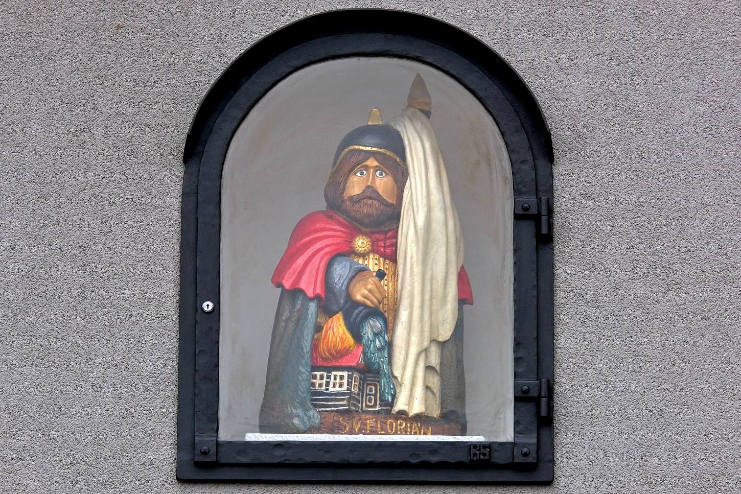 Průčelí nové zbrojnice zdobí socha sv. Floriána, patrona hasičů. Jejím autorem je místní známý všeuměl, muzikant a divadelník Miloš Marek.