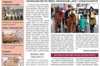 Na počátku nového roku vyšlo další číslo čtvrtletníku Muzea Českého ráje v Turnově. Na osmi stranách si můžeme přečít ty nejaktuálnější informace z činnosti této významné instituce. Nechybí zhodnocení loňské sezony, kdy i přes výrazný úbytek zahraničních návštěvníků, který zaznamenaly všechny památky a muzea, nedošlo v Turnově k výraznému poklesu návštěvníků. Nejnavštívenější výstavou roku 2009 byla prezentace kopií korunovačních klenotů, nejvíce lidí přišlo tradičně na Staročeské trhy. V muzejním čtvrtletníku si můžete přečíst další díl seriálu o jedinečné sbírce manželů Scheybalových, kterou se podařilo muzeu získat jako pozůstalost, nechybí pozvánky na akce (tou nejbližší je Masopust na Dlaskově statku 20. února).