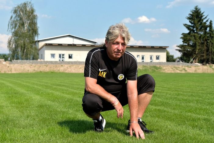„Samotná hrací plocha nám dala hodně zabrat po všech směrech. Jen přesun zeminy z vyšší poloviny terénu do spodní byl pěkný záhul. Jak je obecně známo, pak se na vyrovnanou plochu musí připravit několik vrstev, z nichž v té nejspodnější se budoval odvodňovací drenážní systém, který jistí hrubý makadam. Hodně dlouho pršelo a půda byla mírnou zimou stále rozměklá, takže se na ni dlouho nedalo vjet těžkou technikou. Museli jsme čekat až na pár těch mrazivých dnů, co letošní zima nabídla. Naštěstí jsme vše stihli včetně položení geotextilie a mohli začít navážet písek. Finální vrstva v poměru tři ku jedné s pískem smíchané půdy pro samotný trávník už je také na svém místě, a dokonce už jsme na začátku června stihli i zasít. Nová tráva potom bude udržována vodou z vlastního vrtu za kabinami,“ přiblížil jednotlivé etapy V. Bým, který má celou realizaci stadionu na triku.