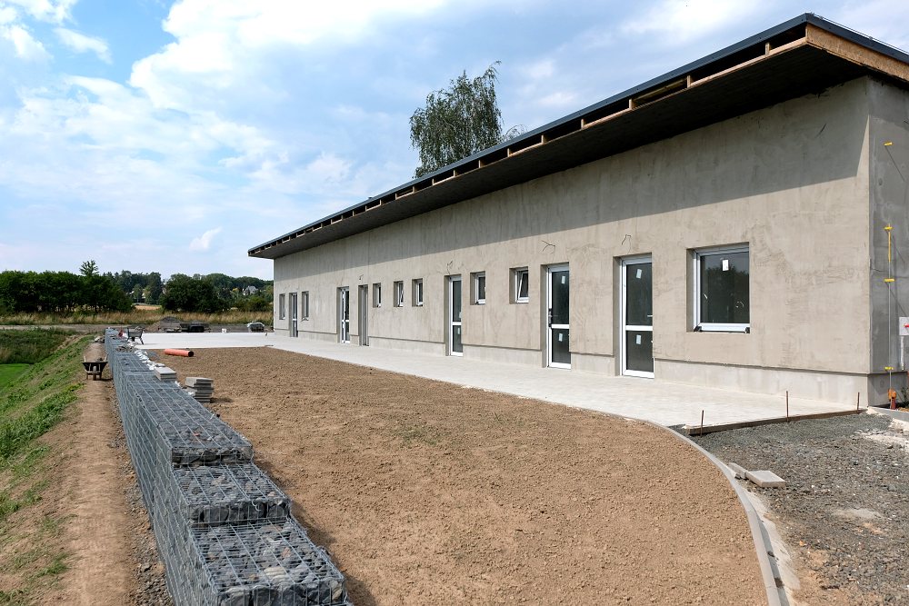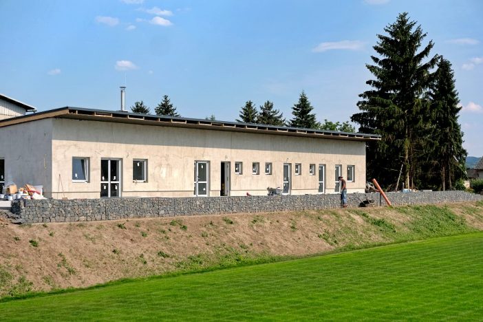 Ale zpátky na budovanou základnu. TvA se dění okolo stavby stadionu poměrně podrobně věnovalo ve všech jejích fázích, takže se jenom posuňme v čase. Vše začalo objektem kabin, který se v současné době dokončuje. Moderní a prostorné interiéry jsou vyvedeny vesměs v klubových barvách a podle funkcionářů FK Přepeře by s realizací celého zázemí ještě před slavnostním otevřením neměl být problém. S tím největším problémem nakonec pomohlo i původně nepřející počasí.