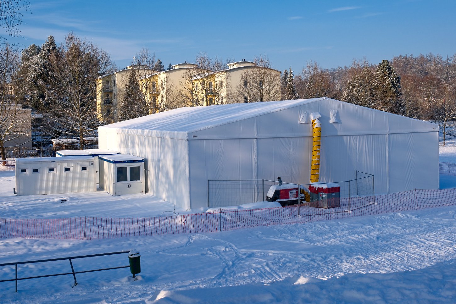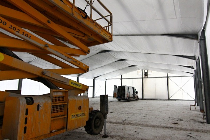 Před otevřením provizorní haly je však stále potřeba dokončit řadu prací. Koncem minulého týdne byl spuštěn tepelný agregát na lehký topný olej (LTO). Vlivem silných mrazů byl povrch haly pokryt sněhem a ledem, které je nutné rozmrazit, srovnat podklad a následně položit umělou trávu.