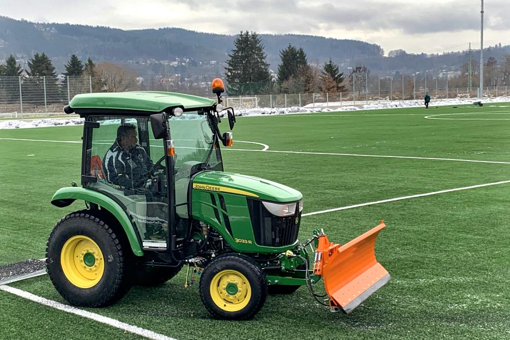 Nový traktůrek značky John Deere je vybaven četným příslušenstvím, takže vedle odhrnování sněhu zvládne také nutné úpravy hrací plochy jako např. kartáčování umělých stébel atp. Na staronovém sportovišti se už dávno trénuje a dají se tu hrát i mistrovské divizní zápasy. O jeho vytíženost tedy nemusí mít nikdo strach.