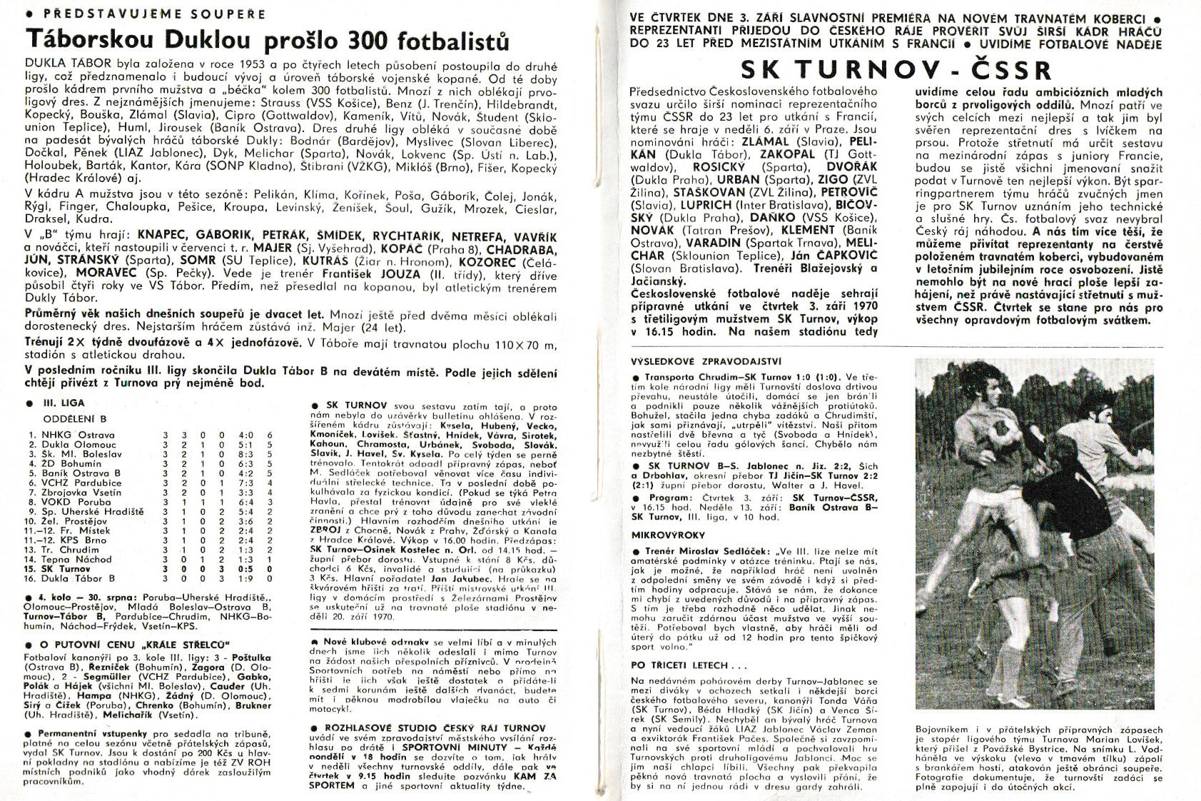 Ve středu večer vyvrcholí schůzkou organizačního výboru horečnaté přípravy na slavnostní uvedení do provozu nového trávníku ve fotbalovém areálu v Koškově ulici, jenž na podzim loňského roku nahradil trávu, která zde byla položena v roce 1969, kdy SK Turnov postoupil poprvé do Národní ligy! Kvůli zakořenění pruhů trávy nařezaných a dovezených z Kozákova bylo tenkrát o rok později v akci ZET za tratí vybudováno náhradní škvárové hřiště o rozměrech 72 x 100 m, kde se také odehrály první ligové zápasy turnovských fotbalistů. Tím prvním byl 16. srpna 1970 duel s týmem ŽD Bohumín, v němž naši „dráteníkům“ podlehli 0:2.