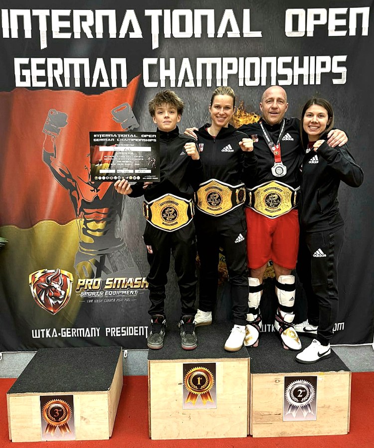 Tommy Kazda (14) ve váze -45 kg kategorie kick-light vybojoval 1. místo, když jeho soupeř po prvním kole finále raději vzdal, a pokračovatel rodinné tradice si mohl připnout pás německého mistra! „V přípravě běhal pět kilometrů kolem 19.30 minut, a to na čtrnáctiletého kluka docela jde,“ je spokojen otec-trenér, jemuž opět udělala radost také Markéta Brožová. V light-contactu svým 60. zápasem v posledních 4,5 letech vyhrála váhovou kategorii -65kg, když ve finále porazila domácí Němku, a také se zaslouženě mohla ozdobit pásem pro vítězku.