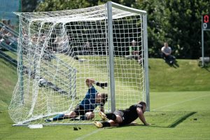 nejvýše vystoupal trutnovský kapitán Zieris a hlavou usměrnil míč do prostoru zadní tyče – 0:1! Ve 21. minutě výborný Kopal nadvakrát pořešil šanci Slavíka. Chvíli na to si sice při dalším krocení meruny vybral jedinou slabší chvilku v duelu T-novů, ale místo obránců mu vypomohla jeho pravá tyč. Na Hofírka v druhé brance to jako první z dálky zkusil Landsfeld, ale jeho pokus skončil v koši strážce trutnovské klece, jenž se pak blýsknul i dalšími