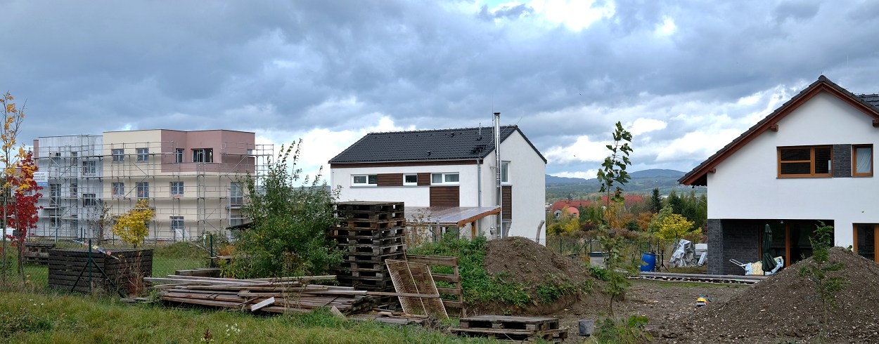 Nějakou dobu se nicméně na stavbě pracovalo, dům má okna a nově i barevnou fasádu.