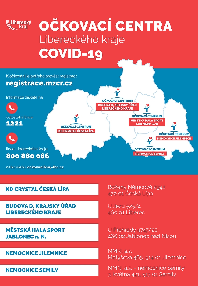Velkokapacitní očkovací centra začnou fungovat od pondělí 22. února na pěti místech Libereckého kraje. Zájemci o vakcínu proti covid-19 se mohou nechat očkovat v Liberci, Jablonci nad Nisou, České Lípě, Jilemnici a v Semilech.