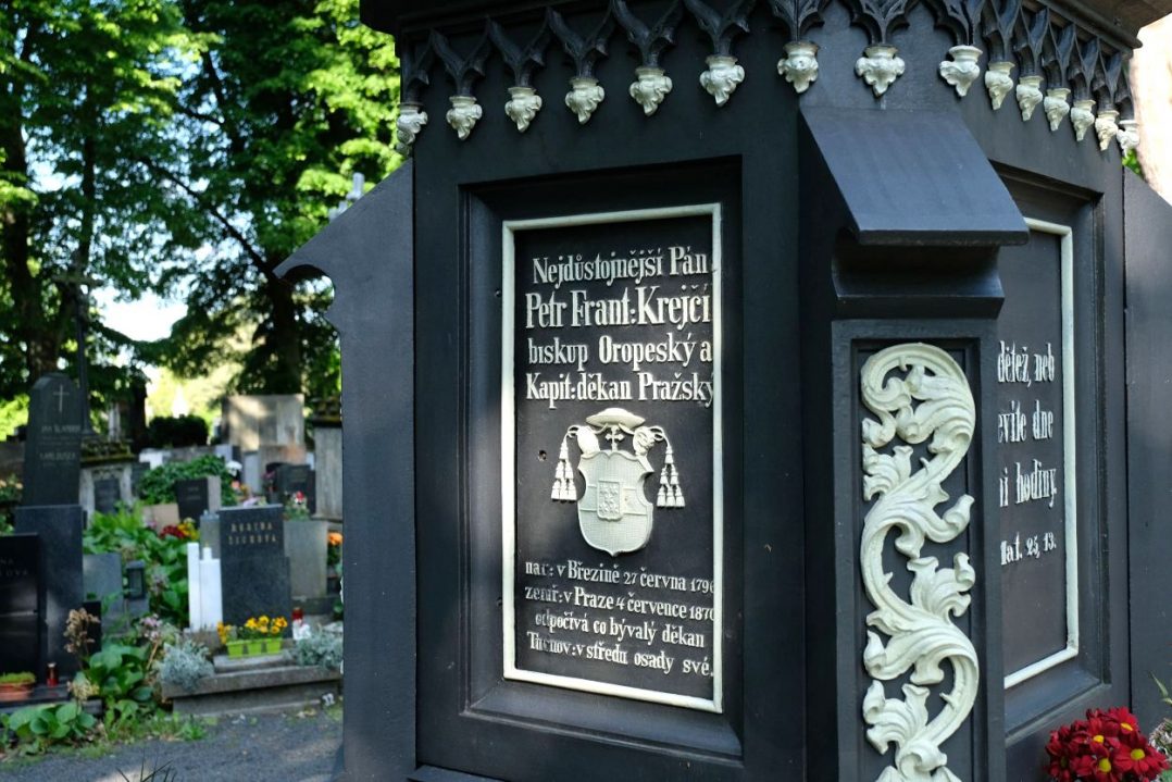 Lidé kolem procházejí denně a málokdo o té skutečnosti ví. Uprostřed hřbitova P. Marie je velký ústřední kříž a pod ním hrobka, kde našel poslední místo odpočinku František Petr Krejčí (27. 6. 1796 – 4. 7. 1870), světící biskup pražský, děkan pražské metropolitní kapituly u sv. Víta a titulární biskup oropský. Byl poslancem Českého zemského sněmu.