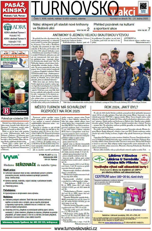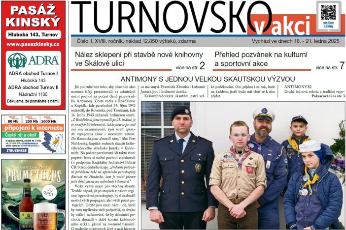 První lednové vydání shrnuje uplynulý rok 2024 a ohlíží se za první velkou akcí tohoto roku v našem regionu, kterou je tradiční vzpomínková akce na paravýsadek Antimony v Rovensku po Troskami. Čtenáře seznamujeme se schváleným rozpočtem města Turnova na rok 2025. Na stránce města se můžete seznámit s novým projektem (RE-USE) na sběrném dvoře, připomínáme výročí spolupráce Turnova a polského Jaworu, věnujeme se úspěšnému projektu vědeckého centra TOPTEC. Sportovní stránce dominuje 50. ročník Silvestrovského běhu. Kulturní a sportovní pozvánky a společenská kronika jsou pevnou součástí novin od jejich počátku…