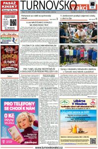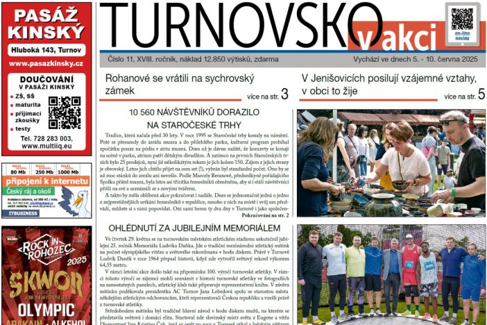 Ohlédnutí za Staročeskými trhy i za jubilejním Memoriálem Ludvíka Daňka. Nová iniciativa občanů Pelešan a Mašova směřující k zásadnímu pohledu na trasování budoucí rychlostní silnice I/35. Pozvánka na Střelnici na 19. června – setkání občanů na téma vedení přeložky I/35 katastrem Turnova. Oprava malé vodní elektrárny ve Shořalém mlýně. Rohanové se vrátili na Sychrov. Na Vyskři se pyšní novými traily. V Jenišovicích posilují vzájemné vztahy, v obci to žije. Informace z městských organizací. Úpravy městského fotbalového stadionu. Kulturní a sportovní servis a společenská kronika.
