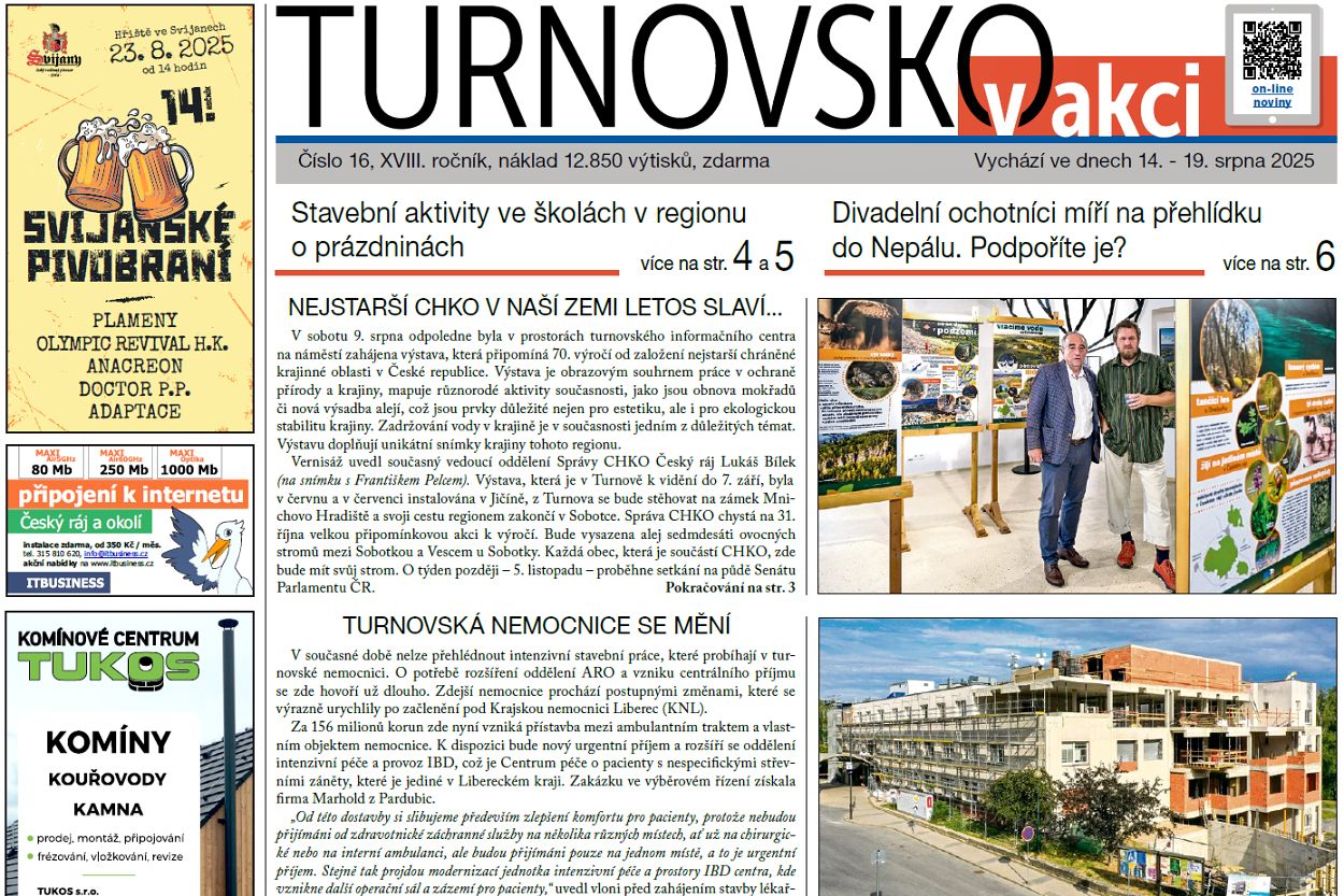 Nejstarší CHKO v naší zemi slaví výročí. Turnovská nemocnice se mění. Přeložka silnice I/35 – pohled z Jičína. Den s mineralogem: Letní hit. Vyskeřští odhalili sochu své patronky. Prázdninové opravy v základních školách v Turnově a v regionu. Nová knihovna dostává finální podobu. Turnovští divadelníci míří do Nepálu. Valdštejn ožije historickými slavnostmi. Začal fotbalový podzim. Opět se konají prestižní závody v orientačním běhu – Pěkné prázdniny v Českém ráji. V novinách samozřejmě najdete také kompletní kulturní a sportovní servis a společenskou kroniku.