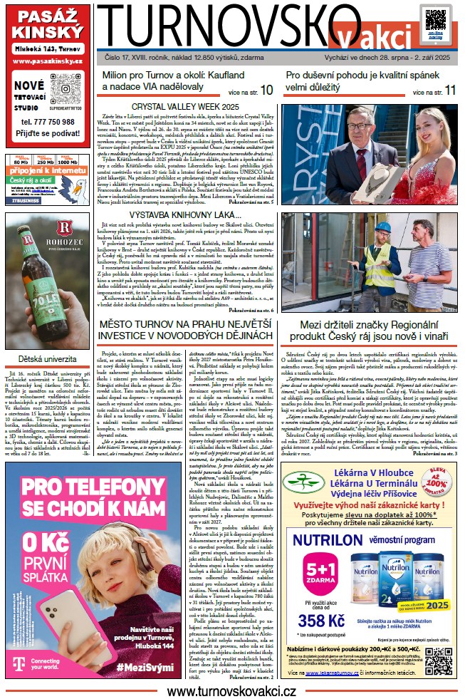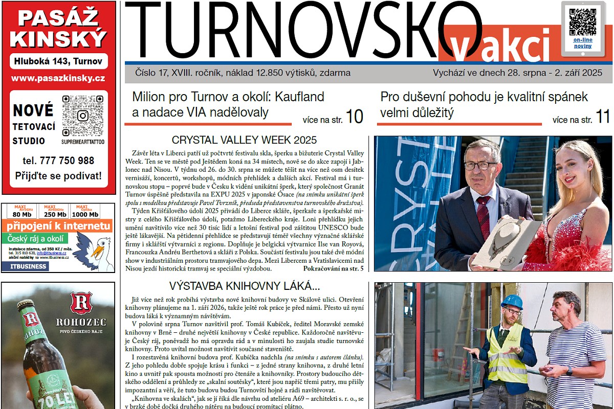 Crystal Valley Week 2025 v Liberci s turnovskou stopou, vzácná návštěva na stavbě knihovny ve Skálově ulici. Turnov před největší investicí v novodobých dějinách. Noví držitelé značky Regionální produkt Český ráj. Změny na železnici – rychlíky do Prahy a Pardubic budou mít nového provozovatele, jen si ale ještě musíme počkat. Přehled hřišť v Turnově. Podzimní nabídka VCT. Kaufland rozdělil na Turnovsku milion korun na smysluplné projekty. Kompletní přehled akcí v týdnu pro duševní zdraví (Ne)blázni Turnove! Lebedárna pod Kozákovem, kdysi pojem, dnes ruina. Kvalitní spánek pro duševní pohodu… V novinách samozřejmě najdete také kompletní kulturní a sportovní servis a společenskou kroniku.